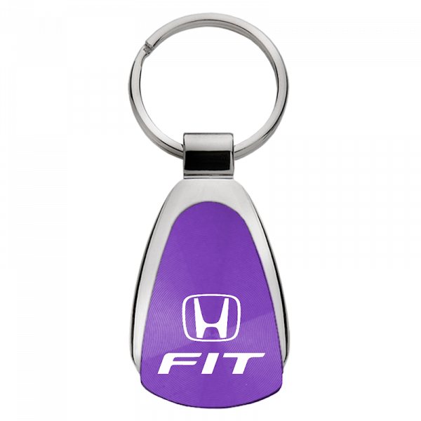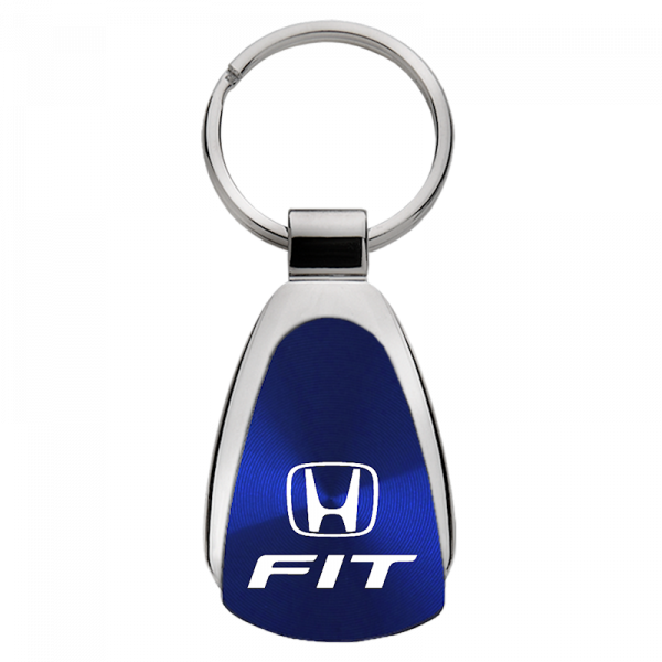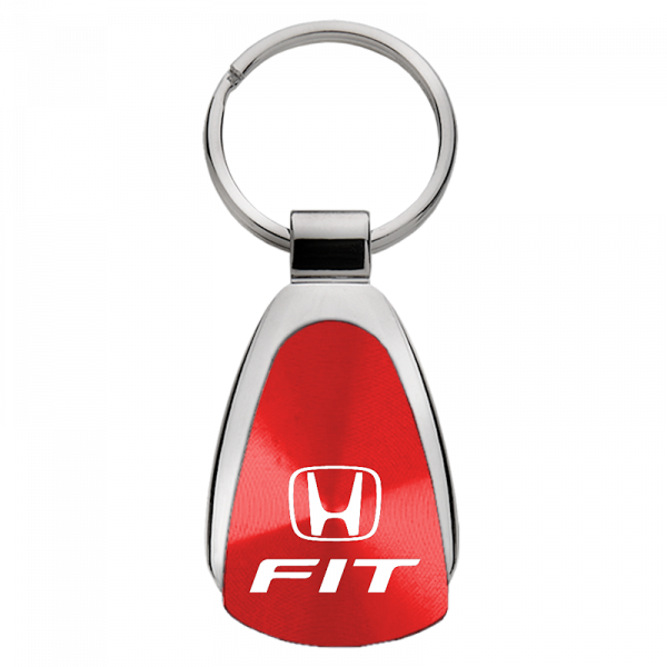 Teardrop key fob. Shiny chrome teardrop keychain with anodized aluminum insert featuring small grooves on the colored face. Precision laser etched logo. Includes a black gift box.