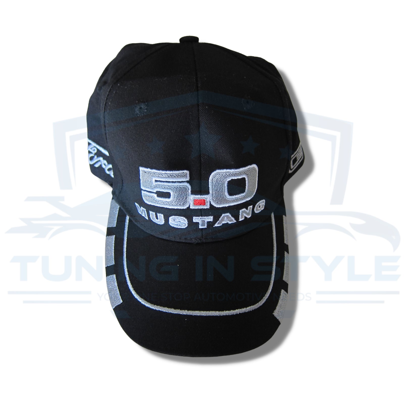 Ford Mustang 5.0 Embroidered Grey Logo Baseball Cap Black Official Licensed
