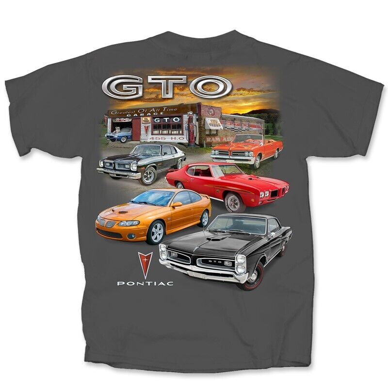 Pontiac GTO Vintage Car Garage Scene Graphic T-Shirt Charcoal Official Licensed
